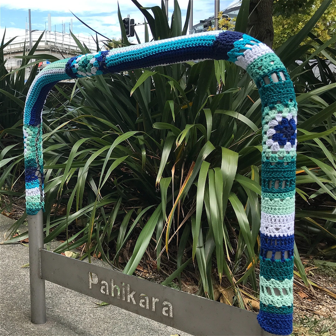 Take a stroll or cycle along K rd to admire joyful knitted and crocheted decorations on the bike parking.